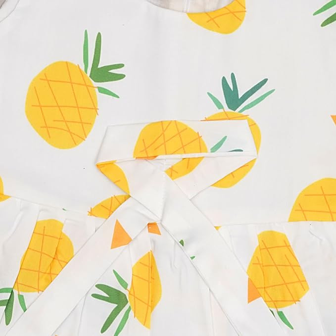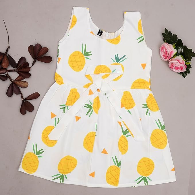 Soft and Comfortable : Made from premium quality, breathable rayon fabric that ensures maximum comfort for your baby's delicate skin. || Care Instructions: Hand wash preferrable, as contains 85% cotton and 15% polyster. Adorable Design: Features cute and attractive , colorful fruit printed designs that are perfect for everyday wear or special occasions. Versatile Use: Great for both casual outings and formal events, providing style and comfort. Perfect Fit: Sleeveless and knee length frock, Available in multiple sizes to ensure the best fit for babies of 1 to 6 years.|| There is Light color change variation due to photographic effect.
