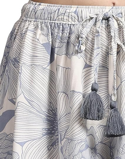 Fabric : 100% Viscose Material Pattern : Floral Closure Type : Elastic Waistband & Adjustable drawstring with matching tassels